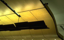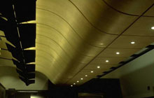 Suspended ceiling of curved birds eye maple panels approximately 30” by 18” reflects light from custom fixtures with adjustable louvres.