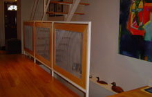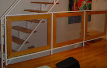 Steel tube ribbed staircase with red oak treads. Railing panels are framed oak and wire mesh.