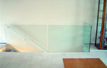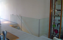 | Glass panels 1/2" thick act as the railing for the staircase. The transparency of the glass minimizes the visual presence while still providing safety. Thick steel hand rails extending up two floors were painted the same colour of the wall so that they would they disappear.