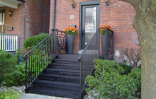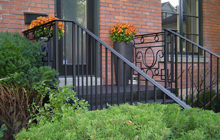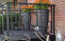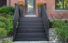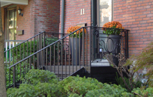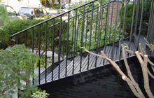 | Structural steel deck and stairs at front of house. Railings a mix of both modern and traditional, designed to fit into surrounding homes metal work. | ||