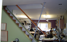 Handrail made of two inch diameter hard maple hand cap with 1/4" steel rib inside for strength. Hand railing mounted to powder coated steel post.