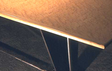 Boardroom table featuring a narrowing of the birds eye maple top designed to accommodate large to small meetings. Steel construction below with oval tube foot rest. |